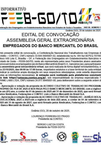FEDERAÇÃO CONVOCA BANCÁRIOS DO BANCO MERCANTIL DO BRASIL PARA ASSEMBLEIA VIRTUAL NO DIA 23 DE OUTUBRO